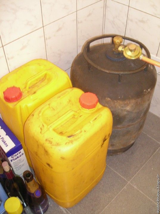 - Les bidons d'eau, et oui qui dit pas de courant, dit pas de surpresseur (qui amene l'eau à notre etage), donc il faut utiliser les bidons d'eau qu'on fait remplir au gars qui a un puit a coté de chez nous. Avec ca on peut faire un brin de vaisselle, remplir les chasses d'eau aussi (eh oui!) et puis se laver un peu, enfin bon se debarbouiller quoi...